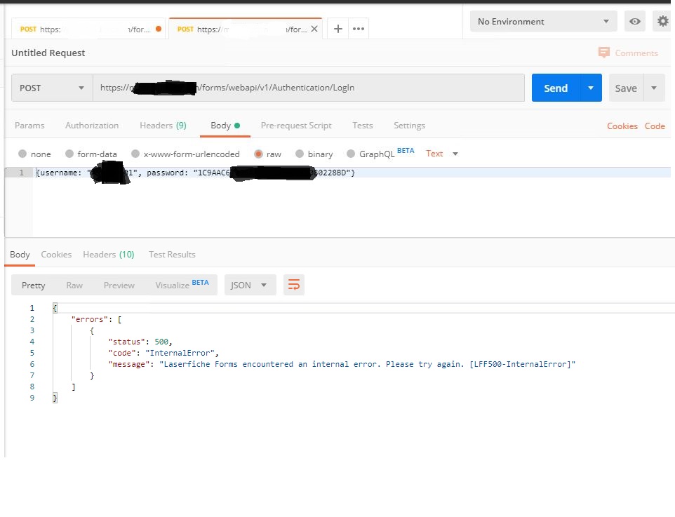 Call made to URL: https://Laserficheformsserver.here.com/forms/webapi/v1/Authentication/LogIn