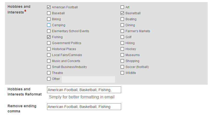 As you can see above, using a checkbox element forces you to set values. They will be automatically set for you if you don't. Those values automatically replace "spaces" with underscores.
