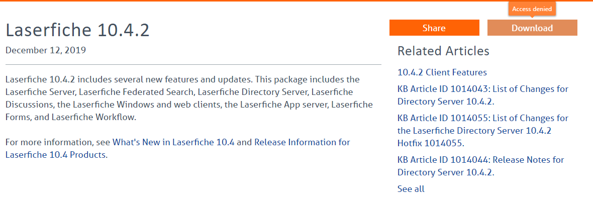 When I try to download Laserfiche 10.4.2 I get access denied. Why is this? I tried downloading older versions and it says the same thing.