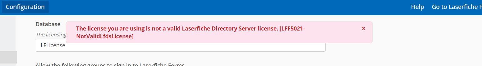 Just upgraded my server and DMZ to the latest LF 10.4.2. My DMZ forms install when configuring the user authentication tab, is throwing the error "The license you are using is not a valid Laserfiche Directory Server license. [LFF5021-NotValidLfdsLicense]" when trying to pull the Forms groups.