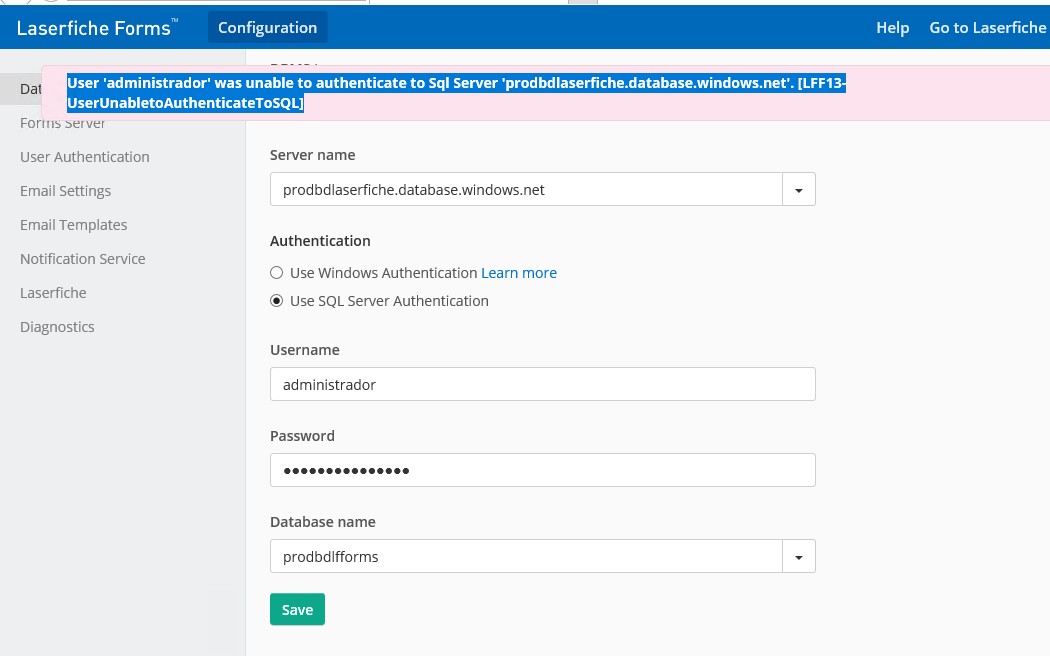 [13]: User 'user_laserfiche_new' was unable to authenticate to Sql Server 'prodbdlaserfiche.database.windows.net'. [LFF13-UserUnabletoAuthenticateToSQL]