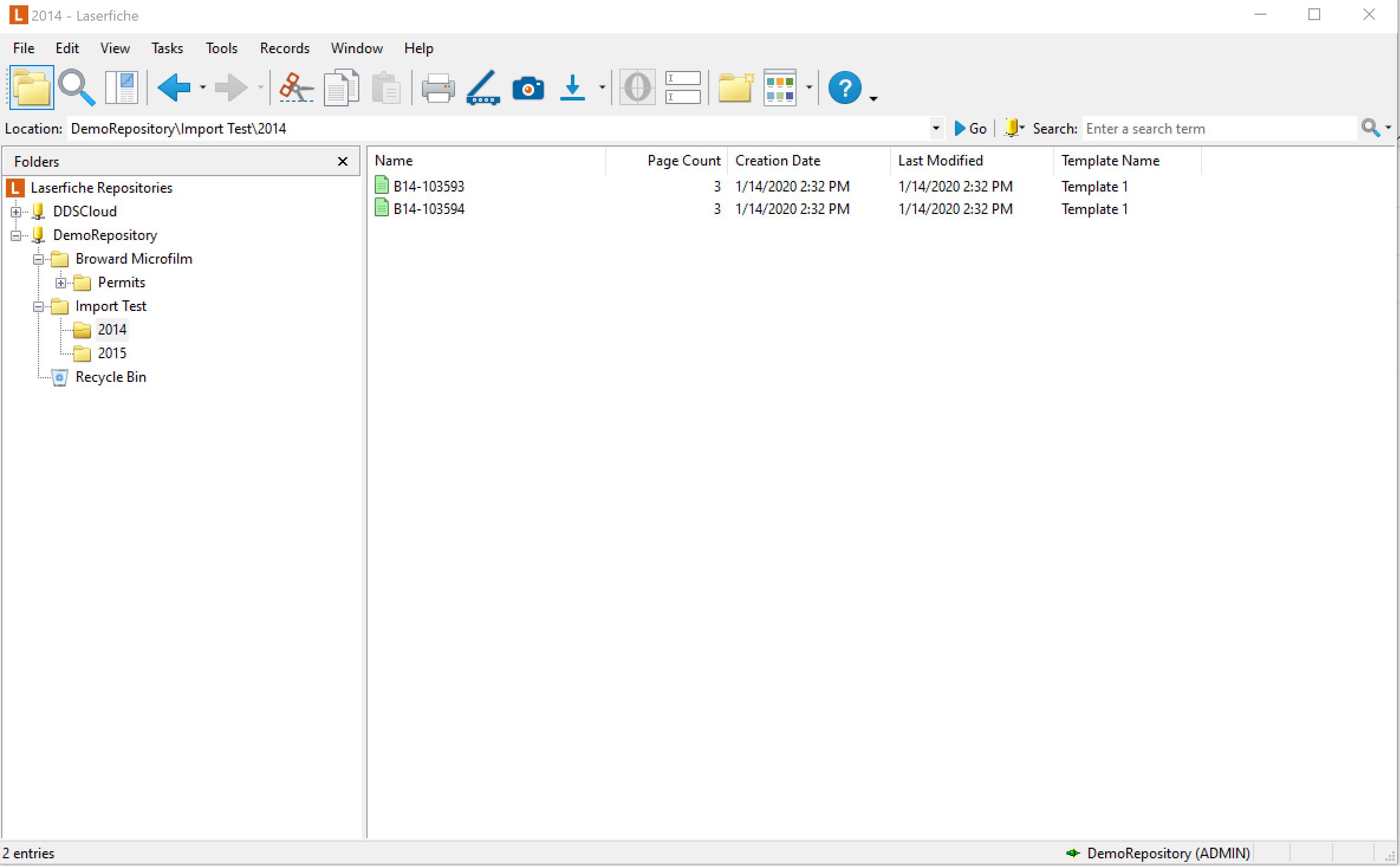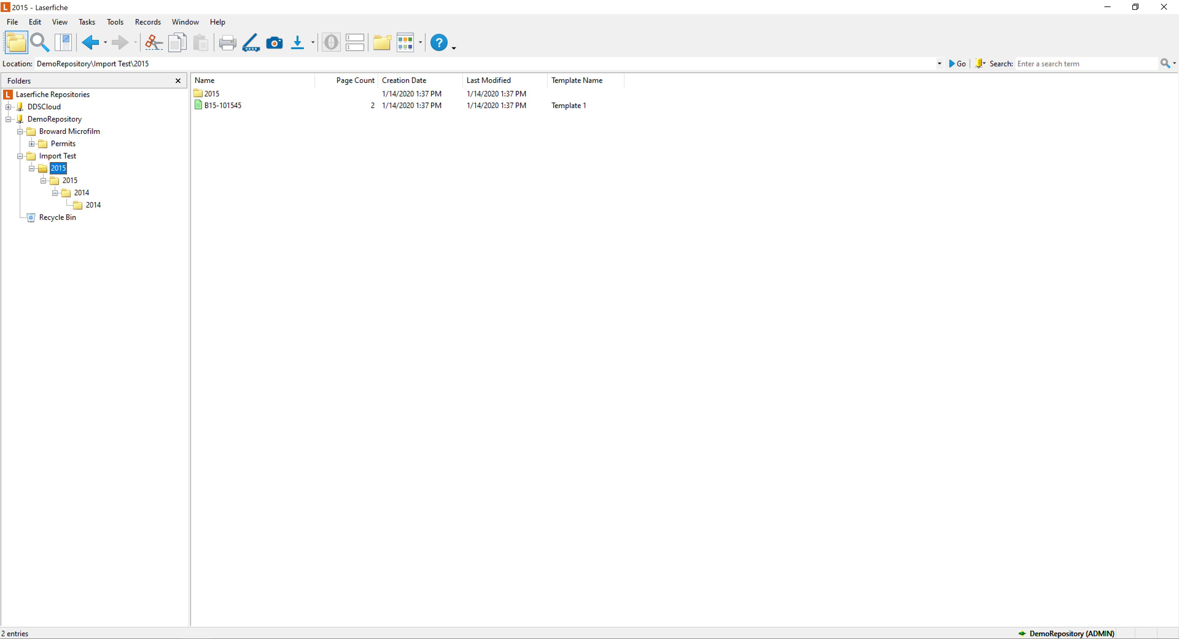 We’re testing with 9 TIF’s that we stored in the folder that Import Agent is monitoring. Our list file is supposed to create 4 documents, in folders called ‘DemoRepository\Import Test\2014’ and ‘DemoRepository\Import Test\2015’. Please see attached LST file. We’ve tested with this version of the LST file, as well as a modified LST file where we removed the values in the parenthesis of the FOLDERS() directive for the 2nd and 4th documents. Neither of these scenarios created the expected folder structure. Please see attached screenshots of resulting folders that were created.