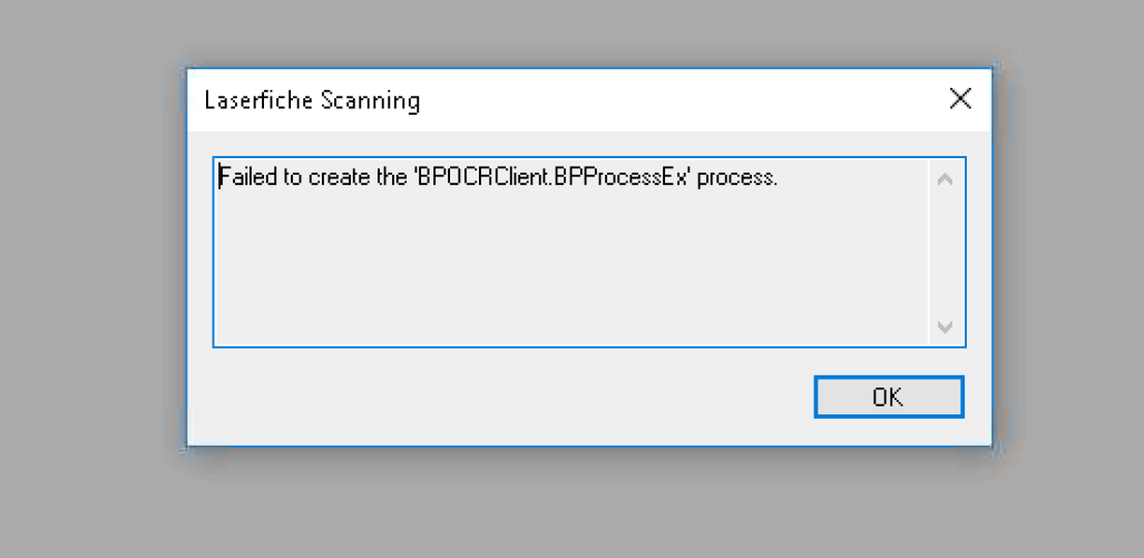 Hi all, I have a client that scans files from a network drive, no scanner attached to the computer. In the folder are 20 plus files and has it configured to do OCR and scan each file as a separate file not one document. When attempting to do this an error comes up now  "failed to create the BPOCR Client.BPProcessEx process"           tried to find that error and it all points to a scanner driver issue but that is not the case here. Went through the routine steps with services and reboot to no avail. I've never seen this error ever before and I'm at uninstalling the client and doing a re-install as I think that is all that's going to fix it. Anyone with more information or suggestion it would be appreciated.