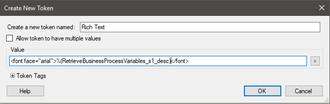 The second piece you mentioned: <font face="arial">Your Rich Text Token Here</font>.