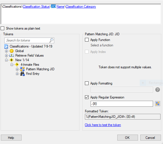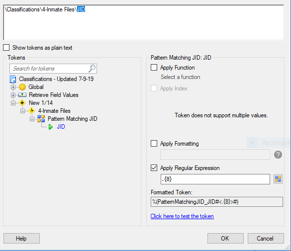 Retrieving the ID number from the Template, with Return set as First match only and Pattern .{8} (Our ID numbers are unique and are 8 digits) Regular expression .{8}