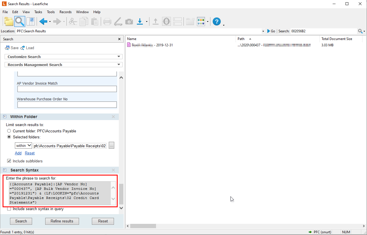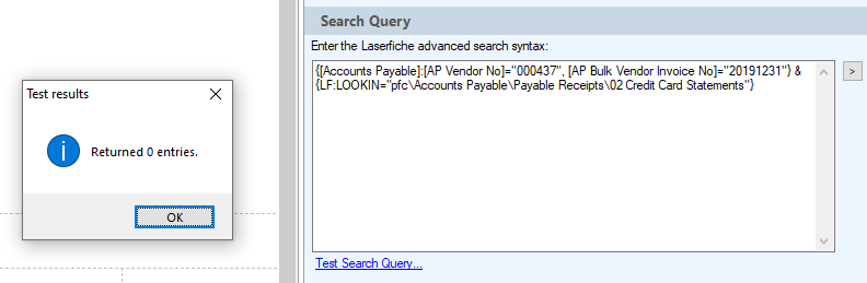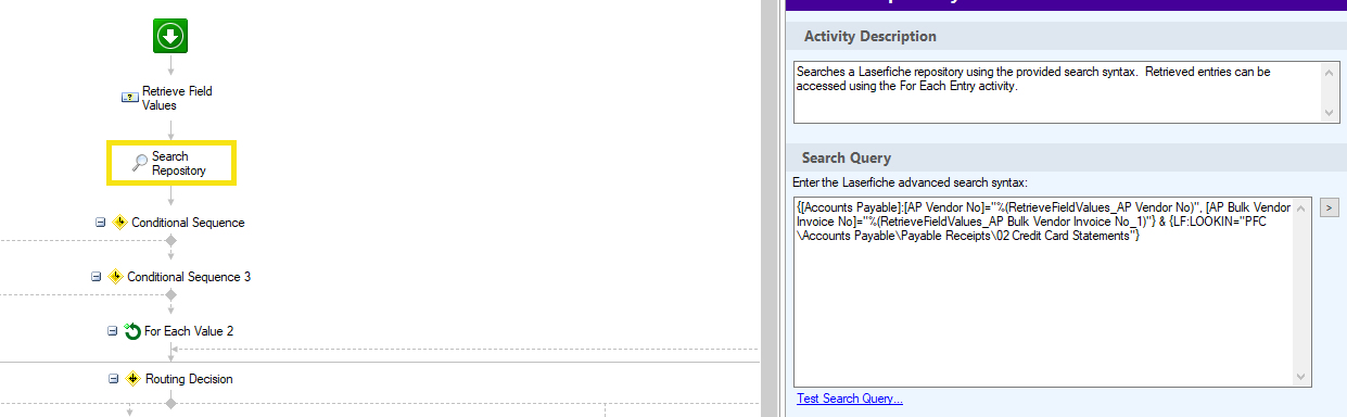 I think I discovered a bug in search syntax. When I ran a search in Laserfiche Client, I get my wanted result. When I copy&paste the search syntax into workflow designer it shows no result. I tried to take out the variables and hard coded the values into search query but still no result. Please check the attached pictures;