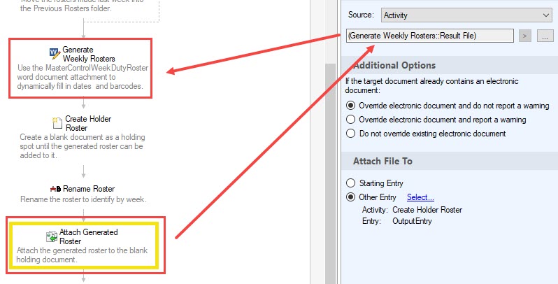 Try switching your activities around. Do "update word document" before "attach electronic file".  The update word document is what creates the electronic file.  Putting attach electronic file first is try to attach no file or a blank file.  The attache electronic file should be asking you what file to attach, and that is where you pick the result of the update word document activity.