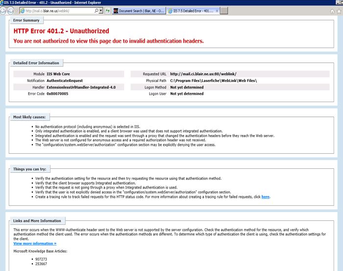 We're using Weblink to enable document search of our repository. All of a sudden when we click on our link we have on our website to get to the laserfiche repository it is requiring a username and password. Any ideas on why and how I can fix this? Attached is a picture of the error from our server.