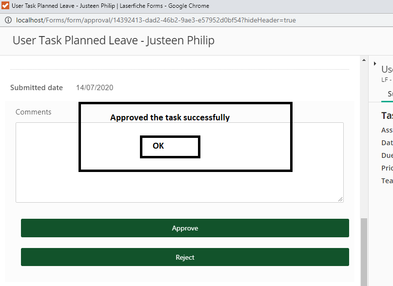 Once form task approved window automatically closed . I wants to show the confirm message to user "You approved the task successfully". How can I do that?