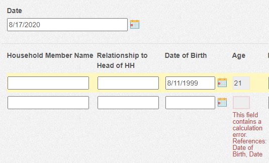 The age calculates fine on the first row. But, when I add another row I get a calculation error. When I enter a birthdate on the new row, the error goes away. Why do I get the error when adding a new row? Thank you.