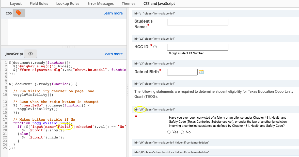 From your screenshot, it looks like you haven't added a mustBeNo CSS class to the radio button field. This must be added to trigger the toggleVisibility function.