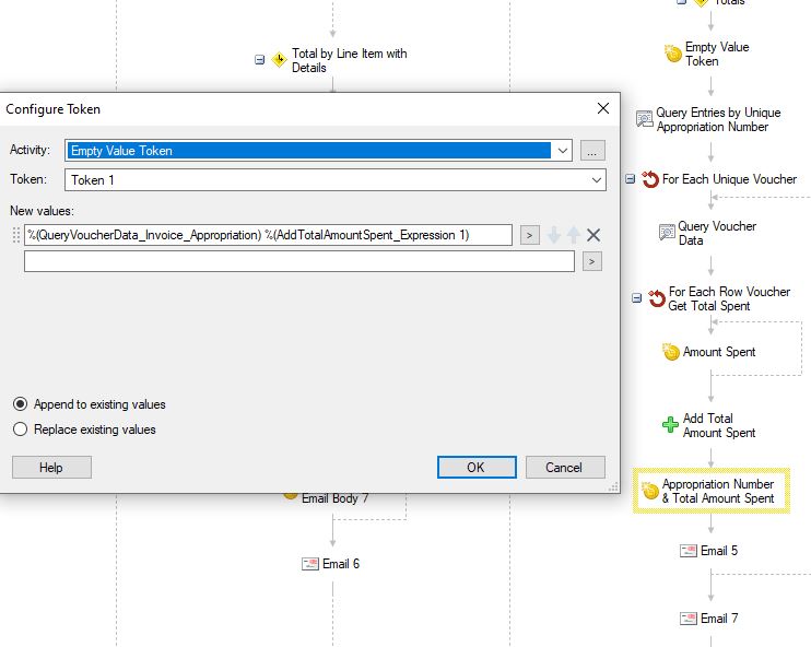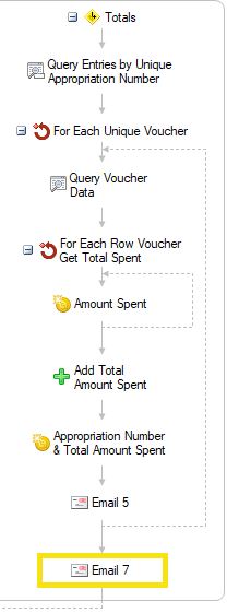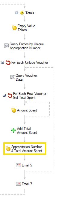 I'm trying to get workflow to total the amount spent per Appropriation Number and then on a email show each Appropriation Number and the total spent. Email5 shows each individual Appropriation Number and the value of the Amount Spent - works fine.