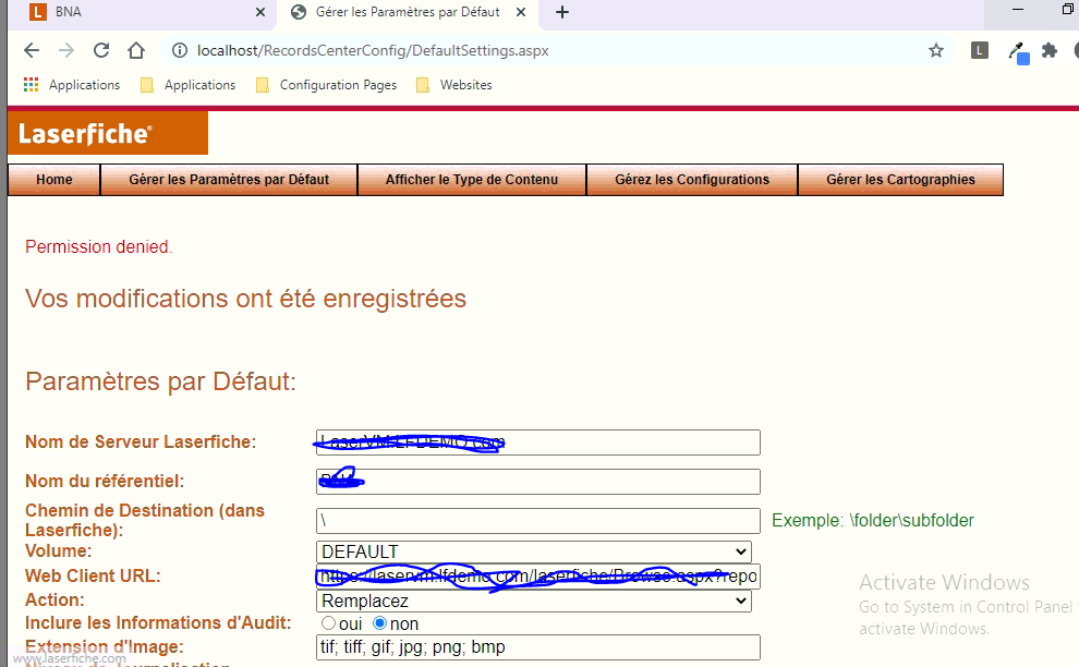 i try to integrate sharepoint to laserfiche but i have some problem, when i configure Record center i have this error 'permission denied', i'm using the sharepoint frame admin for the lfspool in IIS