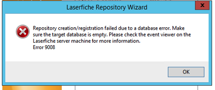 9008 is a generic error indicating the specified SQL database was not reachable. The Laserfiche Server event log should have a more detailed error message indicating what went wrong.