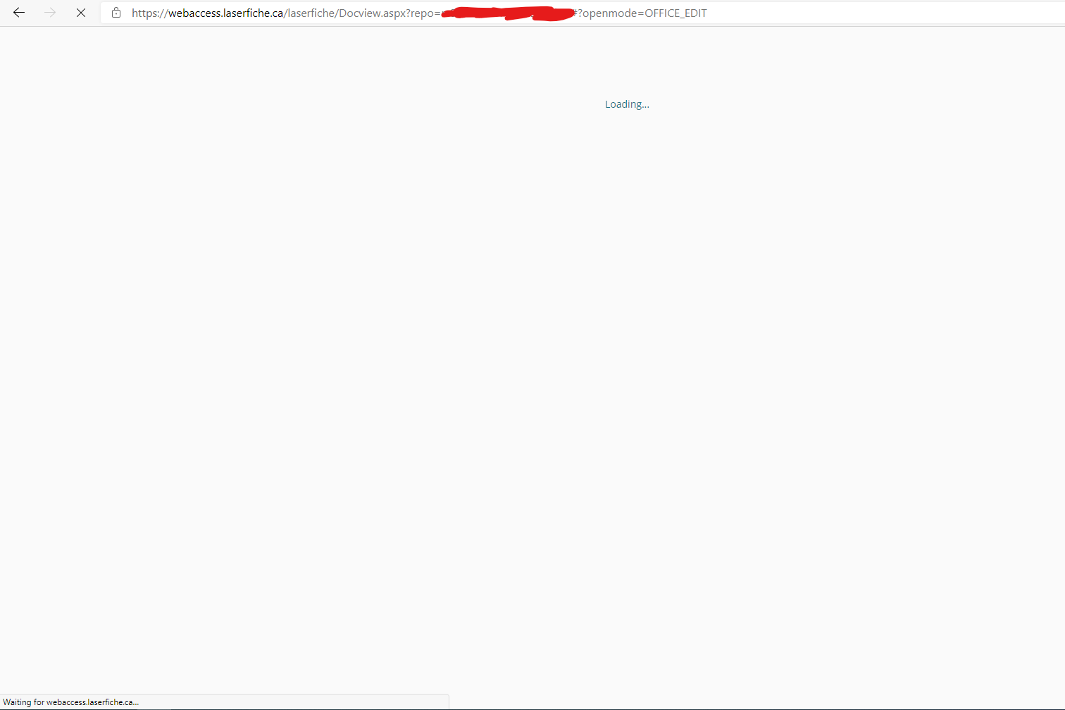Basically when I click Edit in Word Online in the Document Viewer it starts to open Word Online, provides me a Word Online-looking prompt to login to Office 365 so I click Login with a Work or School Account. It seems to perform an SSO login at that point because it refreshes the page without requiring me to type anything in. This is where it gets stuck in a loop. Laserfiche Cloud shows "Loading..." the the page refreshes to the Word Online logo for 1-2 seconds then refreshes back to "Loading..." and keeps cycling between these two screens. The URL doesn't seem to change at all but it remains stuck here.