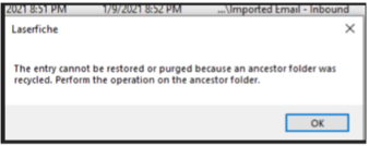"Entry cannot be restored or purged because an ancestor folder was recycled. Perform the operation on the ancestor folder."