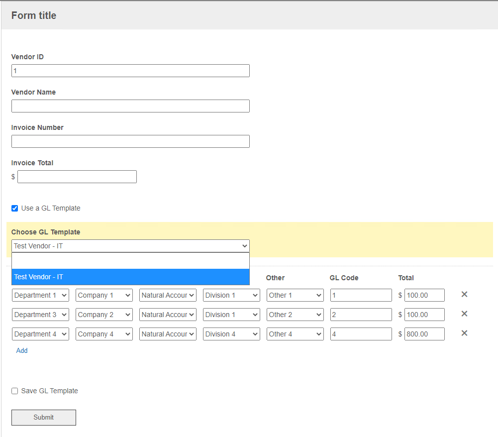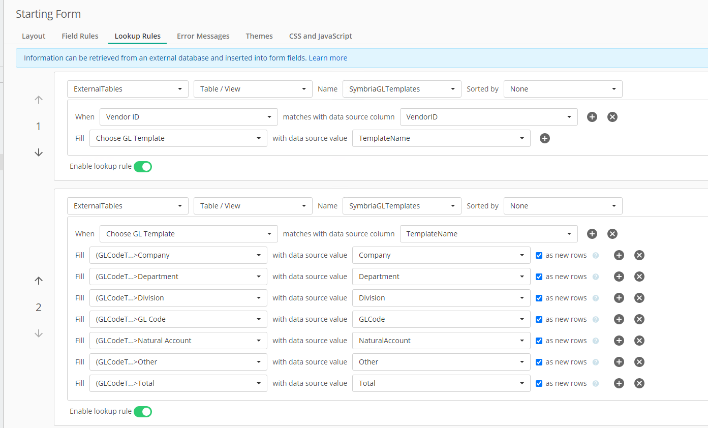 Ideally, I only want the table to populate when the checkbox for "Use a GL Template" and a template is chosen, but since that dropdown gets populated with only 1 result, LF wants to just populate the data ahead of time.