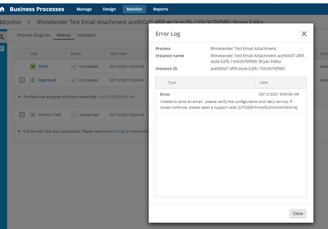 I have a customer that is trying to use the "attachment" option to email uploaded files as part of the business process. Whenever that option is used, emails will not send. I tested on our cloud system, and every time the attachment option is used (both in the email service task and when emailing for a user task), the emails fail to send and suspend the process.