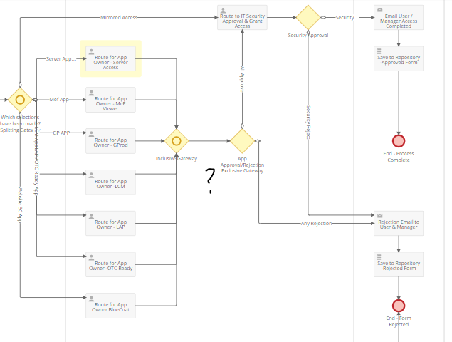 I have a form that goes out to several approvers (7) using an Inclusive Split gateway, depending on selections that are made by the submitter (could be 1 of 7 needed 2 of 7, 3 of 7, so on or all 7). Then once all approvals that are needed come back (based on ones needed, not all) I have another Inclusive Merge gateway, that will send the form to the Final Security Approver. But, somehow what is happening is I get 2 approvals back and it is sending two separate forms to the Final Security approver instead of one combined form. My Final Security form has all of the possible Approver fields on its form.