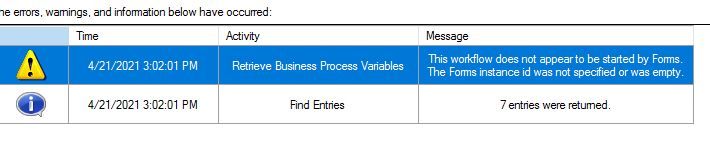 How do a Retrieve Business Process Variables from a form I try to run it and I don't know it running right or not and I keep on getting this warning while running the workflow??