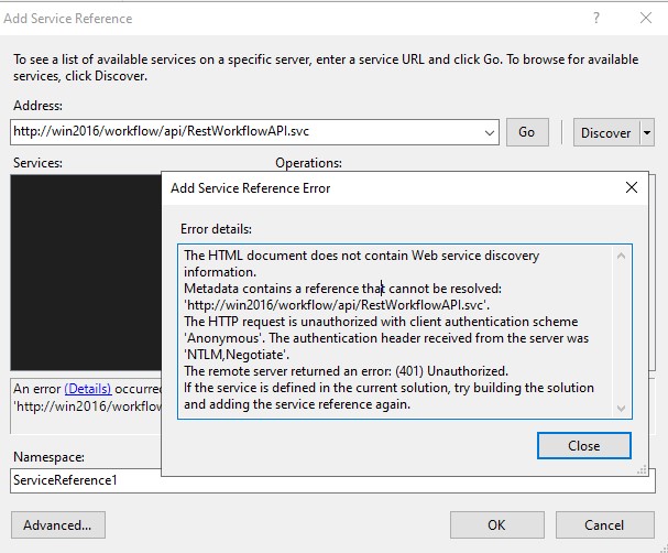 We had a customer recently upgrade from LF 10.2 to LF 11. During the upgrade they also moved to a new server. They have several VS projects that use the /Workflow/api/ web services and since the server move, they have to update their projects to the new server. Originally, they got an error that the authentication was invalid because anonymous authentication was disabled. The enabled anonymous authentication and then they get an error that the "Metadata contains a reference that cannot be resolved: 'http://workflowserver/Workflow/api/RestWorkflowAPI.svc'.". I tested on my Demo system and get the same errors. Originally, I got the error for anonymous authentication and then after enabling it in IIS, I get the same error about the reference cannot be resolved. Below are screenshots from my Demo machine of the config and the error.