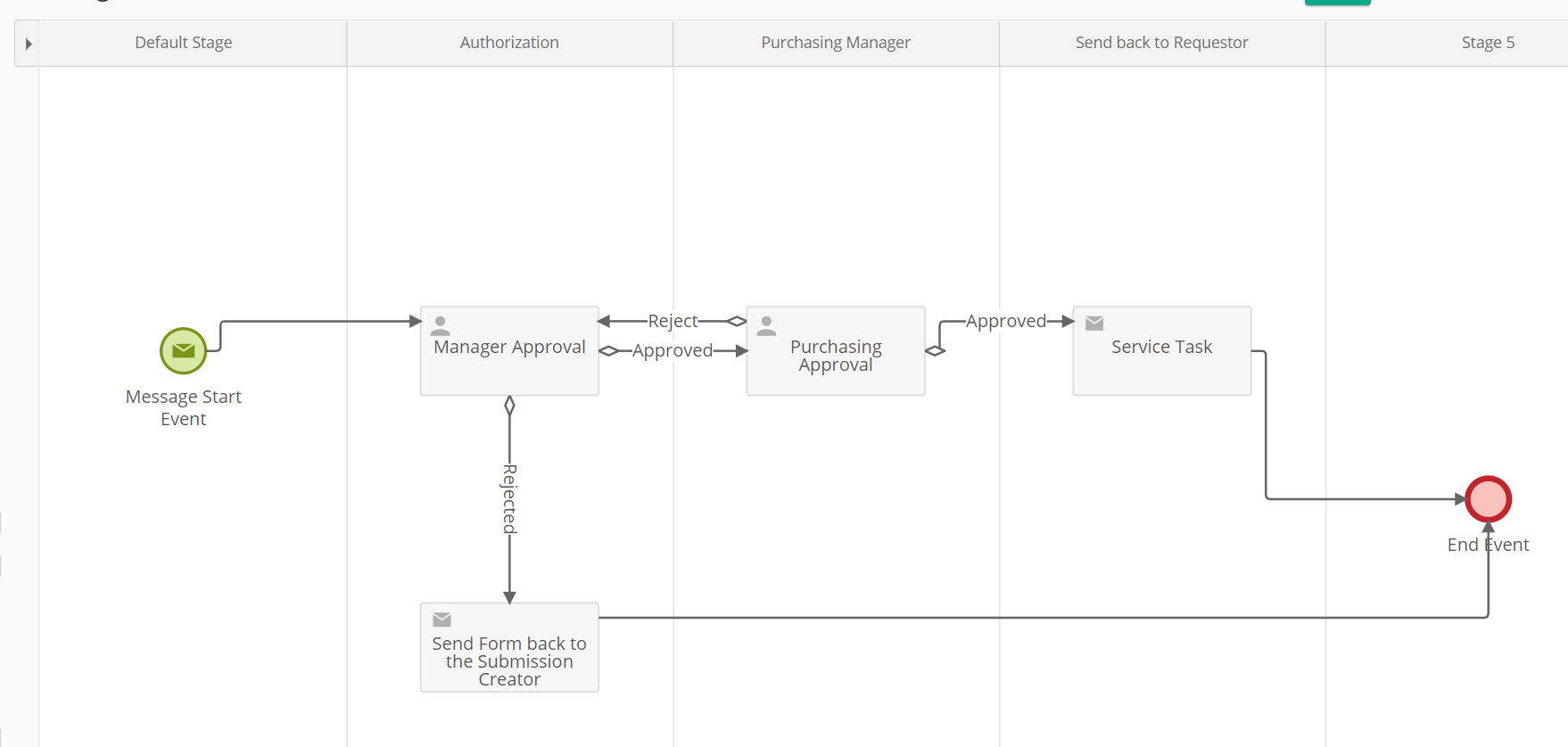 - (Service Task) If approved, the completed form is sent back to the originator via email.