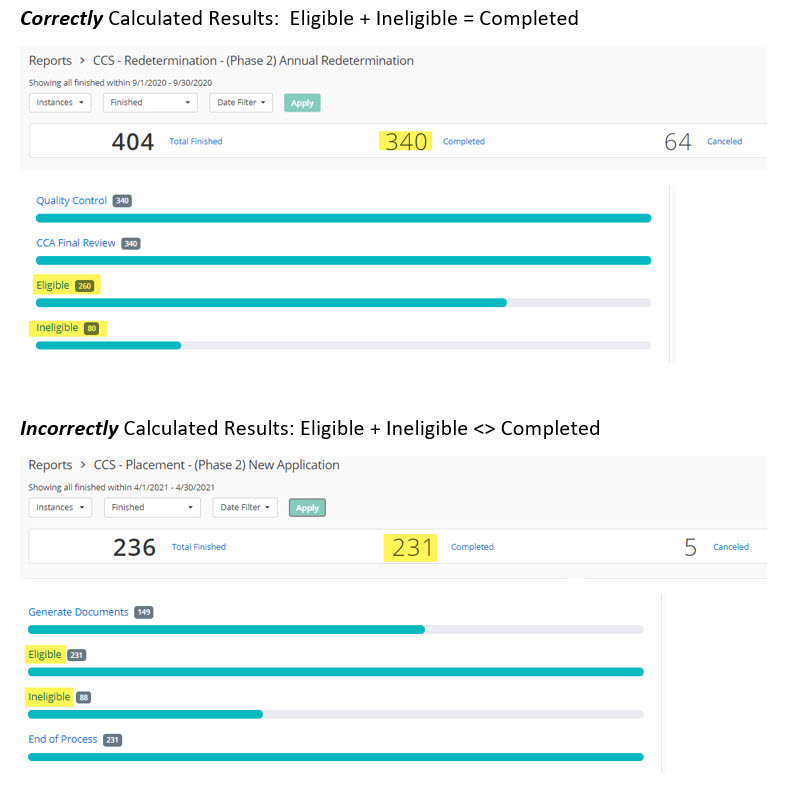 When running the Operational reports the results for these similar processes do not appear to be calculating the same, Example is # Eligible + # Ineligible = # Completed. See the screenshot below for how the report differs for the 2 processes.