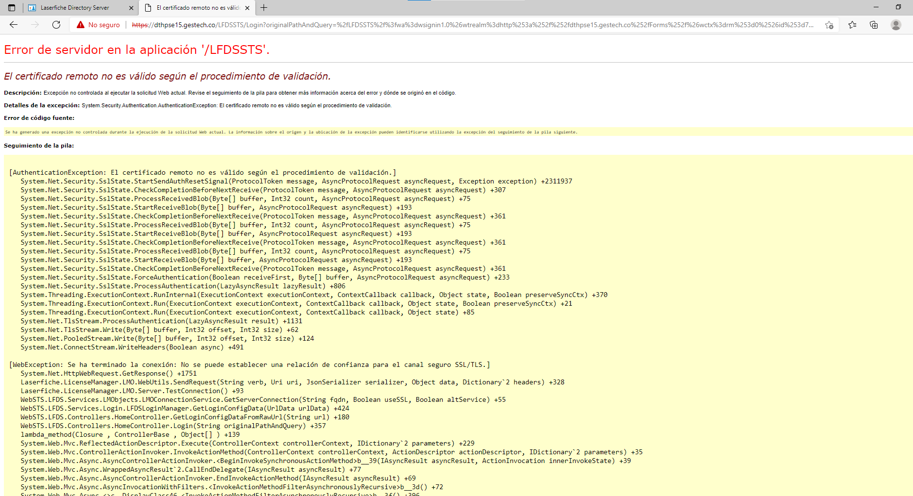 configure form y cuando precione la opcion ir a laserfiche form me sale este error Error de servidor en la aplicación '/LFDSSTS' El certificado remoto no es válido según el procedimiento de validación