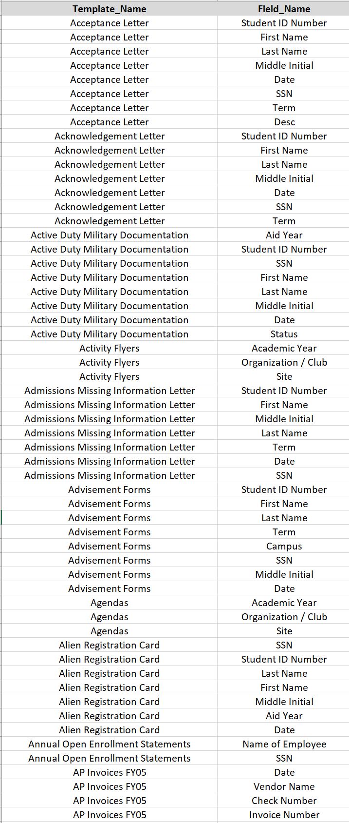 So you do all Templates and then all the fields, using Select Distinct [field name] for the fields.