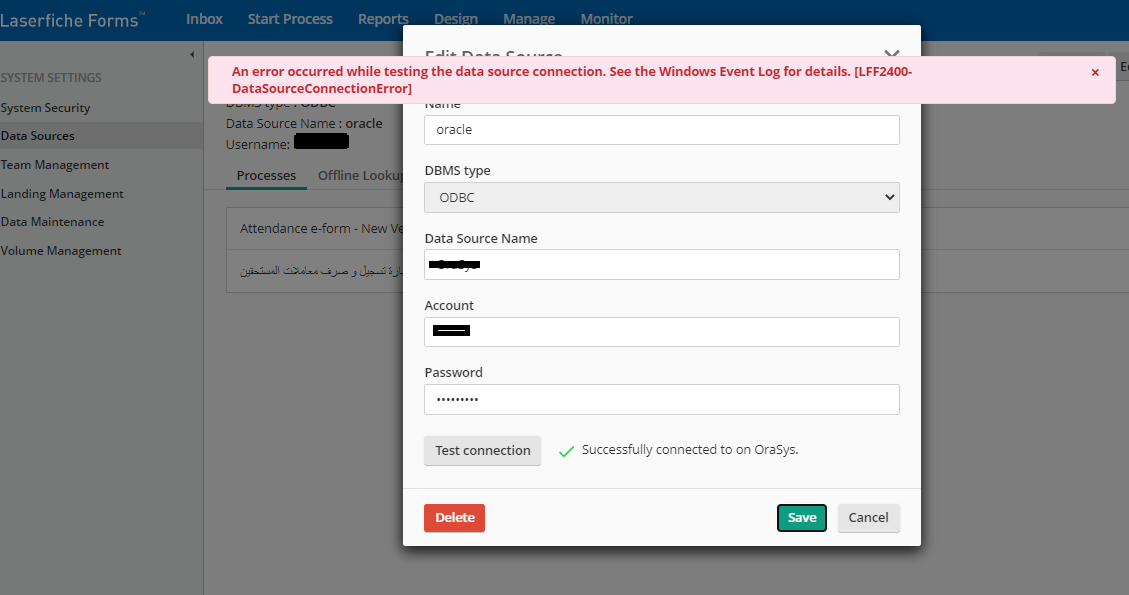 When I'm tried to connect the laserfiche with oracle database throw ODBC and all test connections are successful in forms and ODBC, but when I clicked  save the data source in laserfiche forms, I got these error :
