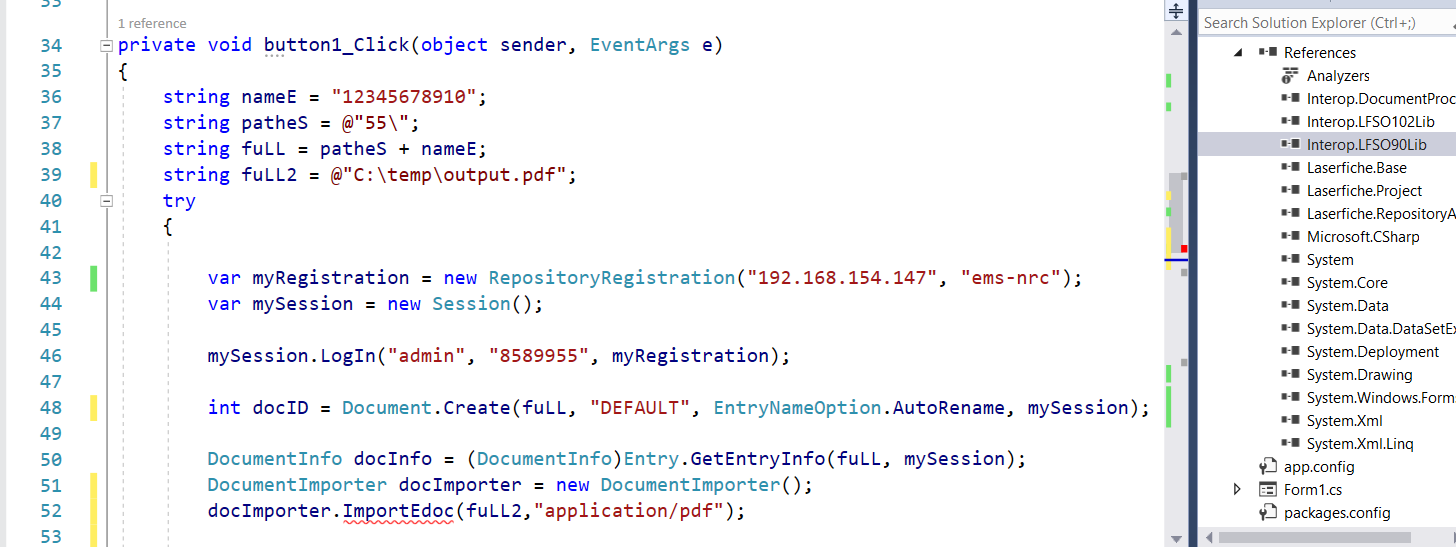 I have been trying for a long time to import a PDF file into my repository, but the problem is in the (docImporter.ImportEdoc) Is there an error in the code, knowing that I created a new project, but the same problem and I did not find any solution for it