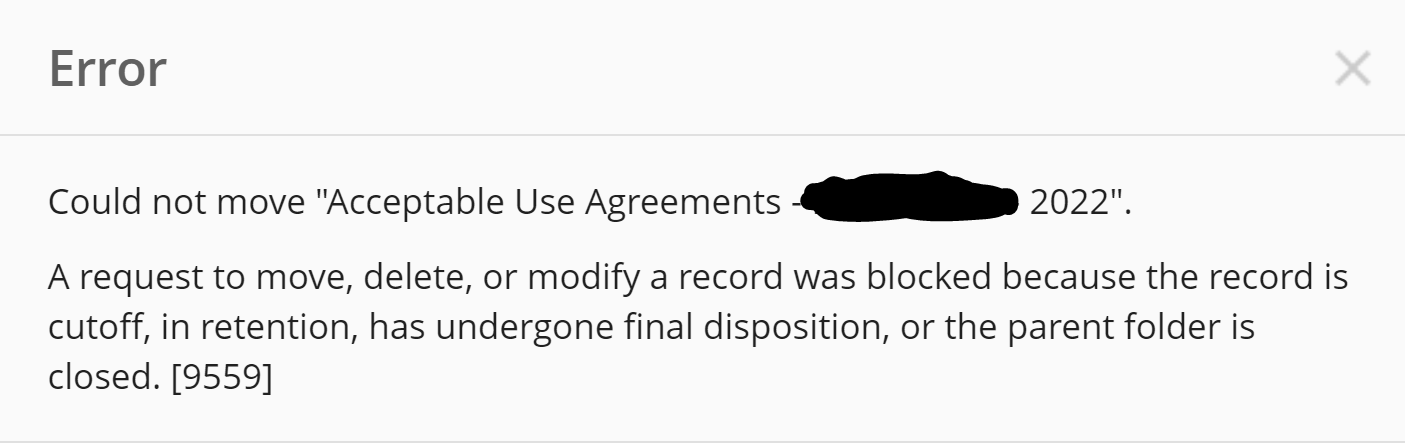 Unfortunately that has not been my experience. As far as I know this client doesn't use Vault, but trying to move any cutoff document via workflow or otherwise, to any other folder results in the attached message. The parent folder is not closed. Though certainly there could be a different issue causing this.
