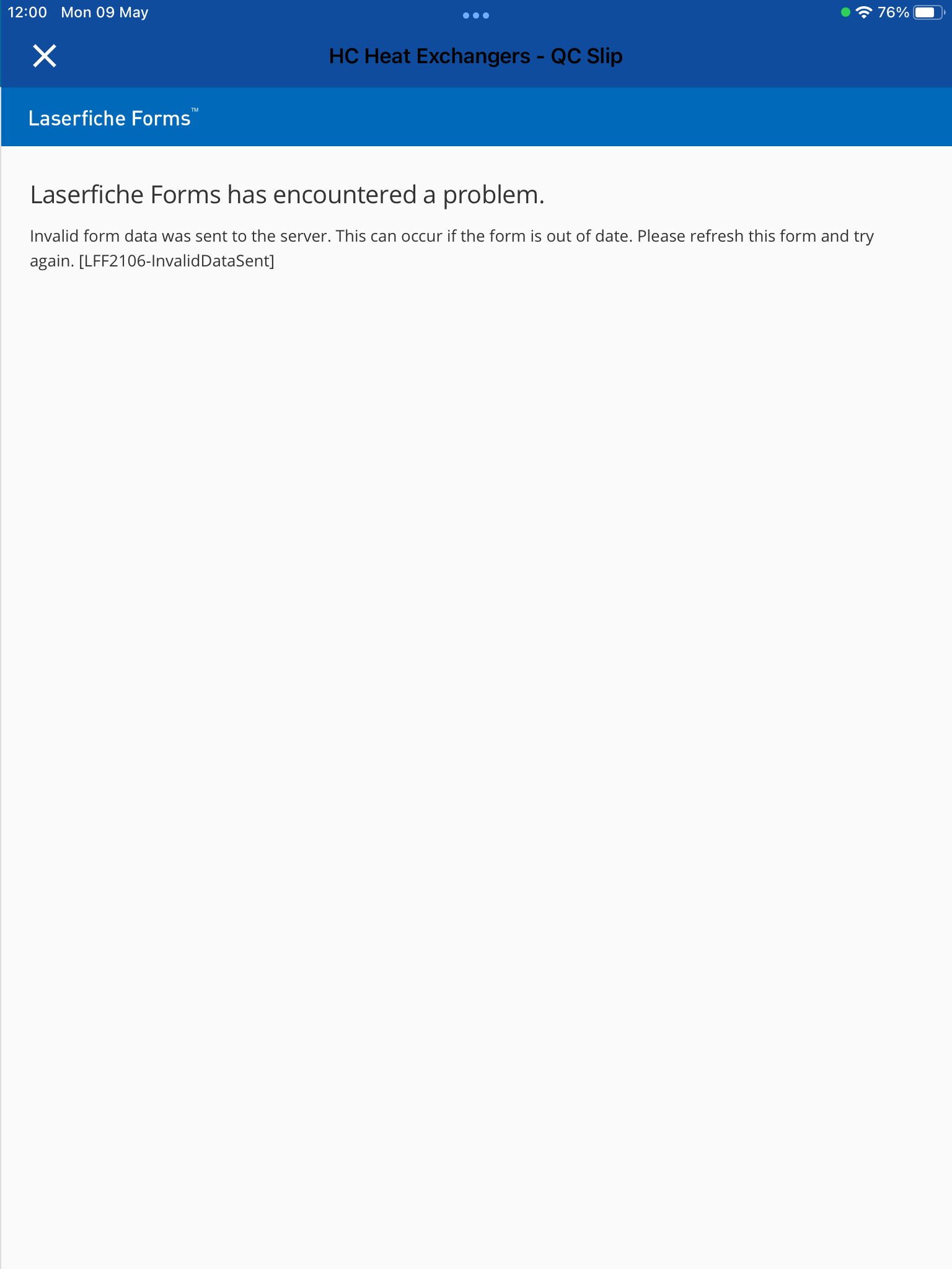 Since the QC process is fully functional it leads me to believe that there is a programming error within form that needs to be fixed.