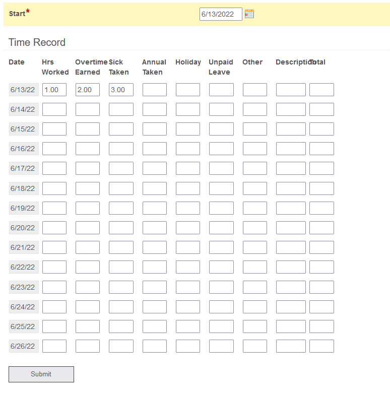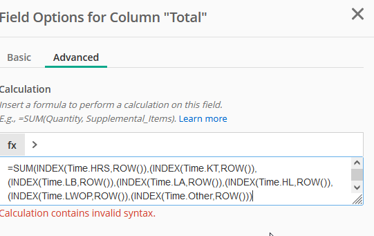 =SUM(INDEX(Time.HRS,ROW()),(INDEX(Time.KT,ROW()),(INDEX(Time.LB,ROW()),(INDEX(Time.LA,ROW()),(INDEX(Time.HL,ROW()),(INDEX(Time.LWOP,ROW()),(INDEX(Time.Other,ROW()))