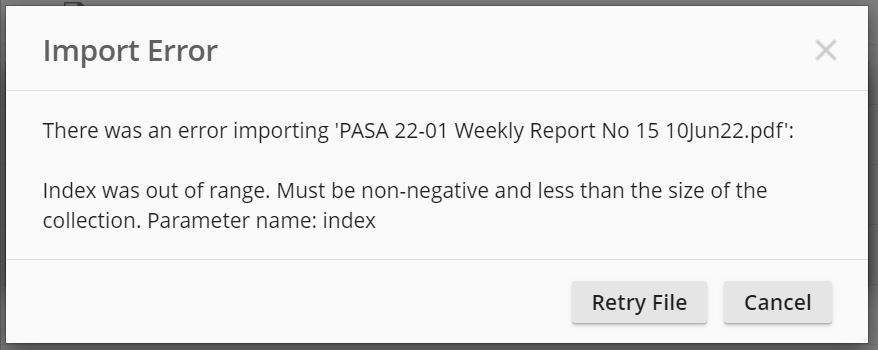 With the use of Laserfiche Web 11.0, I have user who is experiencing this Import Error: "Index was out of range. Must be non-negative and less than the size of the collection. Parameter name: index" when uploading or importing or drag-and-dropping the pdf files into the repository folder. The last time the user imported the other pdfs successfully into the folder, it was in May. Thereafter, the user says the import error kept on prohibiting the import process. As an administrator, I have tried to import the same pdf files with the hope that my administration rights will enable me to import these pdf files, but to no success. Otherwise the other file formats are imported successfully as per norm. Kindly assist urgently.