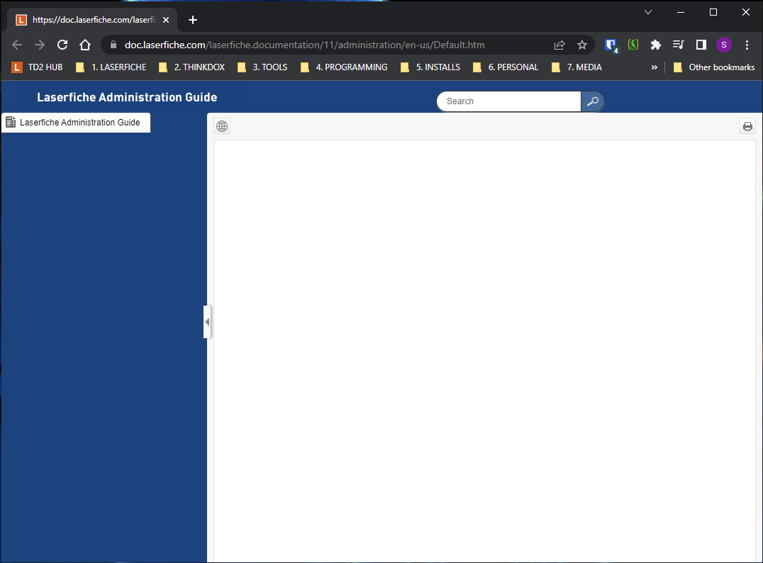 When attempting to open the Laserfiche Administration Guide 11 it simply loads the framework without content (refer to screenshot attached). I have attempted to open from https://support.laserfiche.com/kb/1012253/current-online-laserfiche-product-help-files as well as from the cloud documentation https://doc.laserfiche.com/laserfiche.documentation/en-us/Default.htm by clicking the link indicating I am not using LF Cloud. All roads lead to the same blank page.