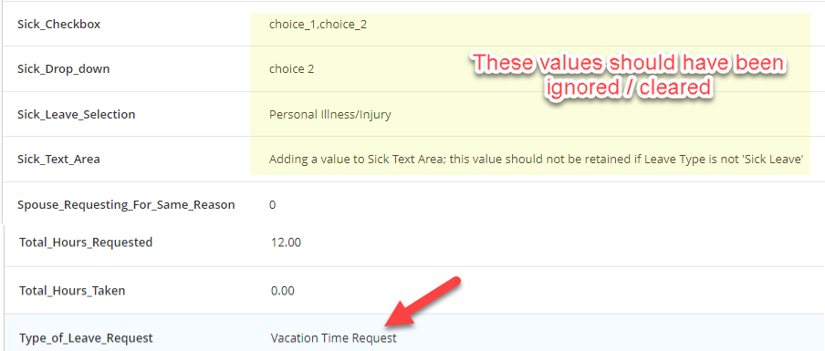 Thanks for clarifying Jason!  You are correct regarding the need for previous submission; I'm updating my posting accordingly.  I also took a screenshot of a modified Leave Request Form wherein I changed my Leave Type.  I have some fields I added that were only visible (and otherwise ignored) for Sick Leave, so when I changed the Leave Type on a subsequent submission those Sick Leave values should have been ignored.