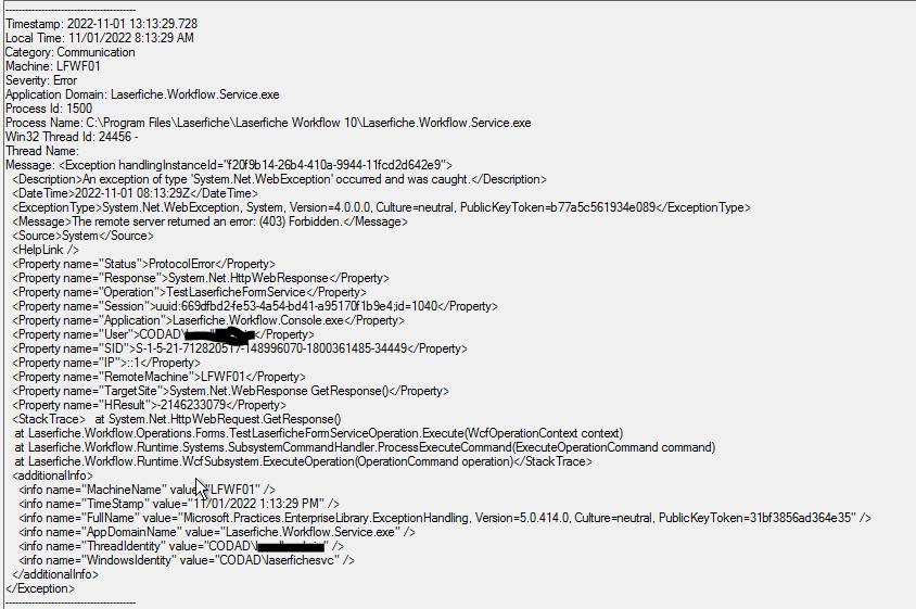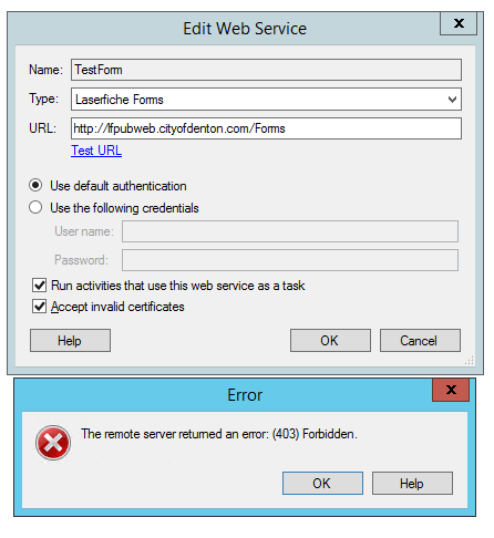 I have a user that is trying to use Retrieve Business Process Variables and upon configuring the Web Services to access the Forms server, they are getting "The remote server returned an error: (403) Forbidden" when testing the URL.