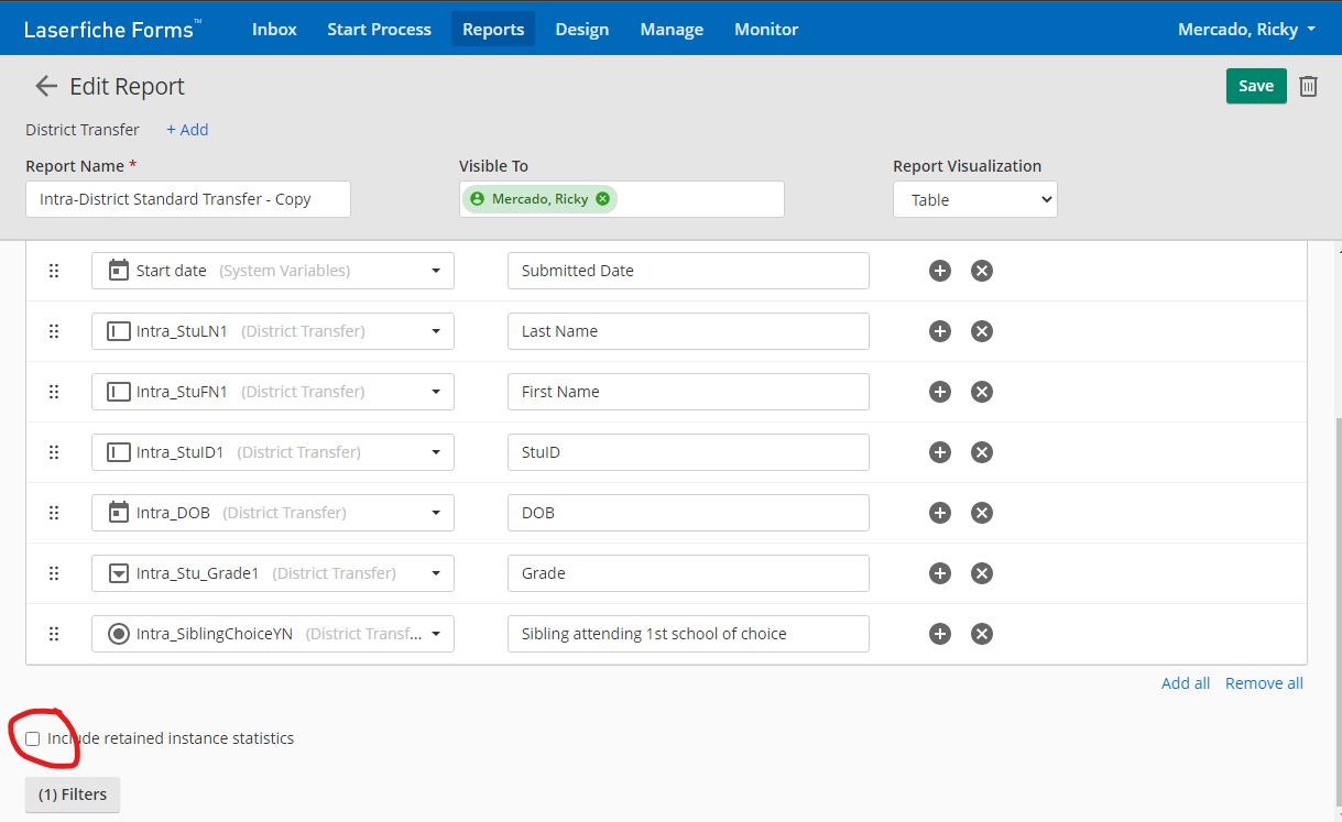 I created a custom report for a customer. The issue I'm having is that it creates multiple columns for each variable. In Forms, I have a single line variable "Grade" and a radio "Yes or No". How can I fix this to where it would only show the original column?