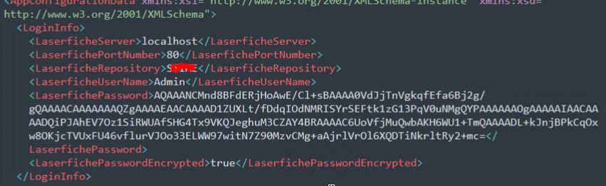 <LaserfichePassword>xxxxx</LaserfichePassword> <LaserfichePasswordEncrypted>false</LaserfichePasswordEncrypted>