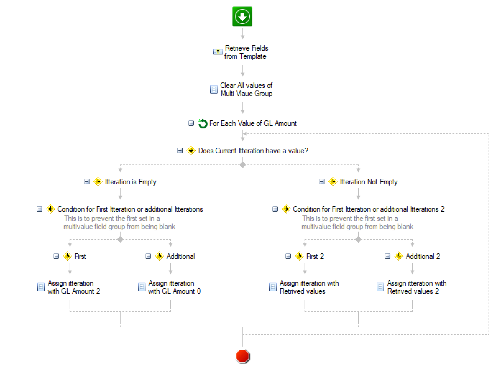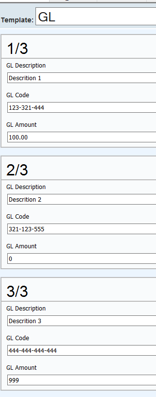 We have a customer who uses a multi-value field group to group together GL codes and the dollar amount assigned to each GL code. They have requested that at some point in the process, we look at the 'GL Amount' field and replace blank values with a 0. The default value for this field is already 0, but for some reason they still periodically end up with some that have a GL code filled out, but the GL amount is 0. Example below: