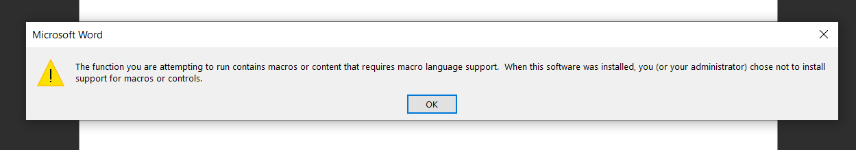 Turning off Visual Basic for Applications has helped fix the issue with opening excel files generated out of Quickbooks. However, it has created a new error when opening Word docs from any location, even a brand new Word doc. Luckily, if we click the popup three times, it goes away but we’d prefer not to have it at all. I've attached the popup below.