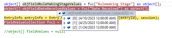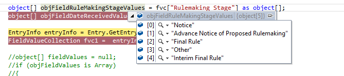 object FieldRuleMakingStageValues = myEntry.GetFieldValue("Rulemaking Stage");
