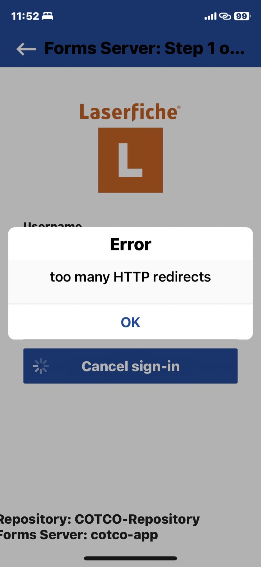 We are facing issue to login to Laserfiche mobile by using iPhone IOS! Please see an error when we try to login.