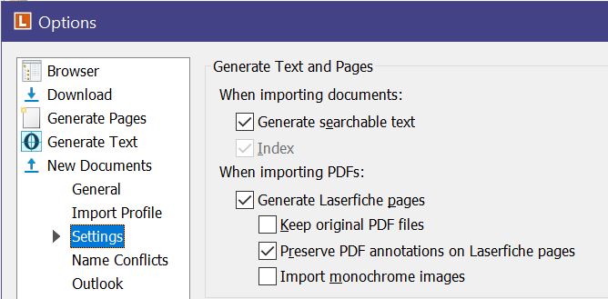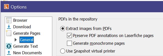 All of my settings are attached that I believe affect this process. I have read that though "Preserve PDF annotations on Laserfiche pages" is checked under importing PDFs, Forms does not use these settings.