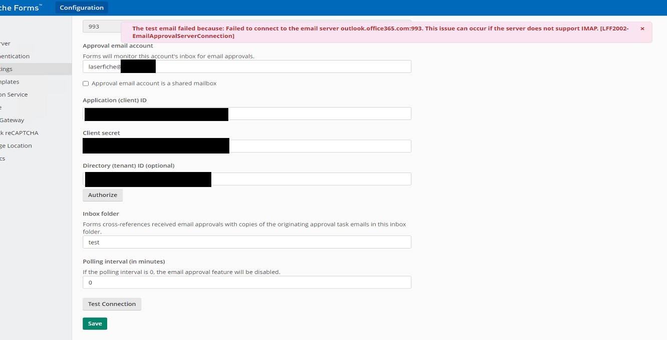 Please note that we are facing a problem while we trying to apply the Email Approval server settings on Laserfiche application.