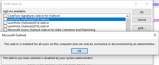 The Laserfiche M365 add-ins are being installed automatically for all users and cannot be managed by the individual. We need a central way to remove it from all end users. However, it also is not an add-in that has been deployed through Microsoft 365, so we are unable to manage it from the Microsoft Admin Center as well.