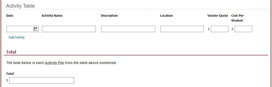 I'm trying to come up with a formula to total up a column within a table. The table will have a varying number of rows so depending on how many Activity Fees are added. Has anyone done something like this? I need to add all of the Vendor Quote fields together at the bottom in the form in the Total field. Thanks.