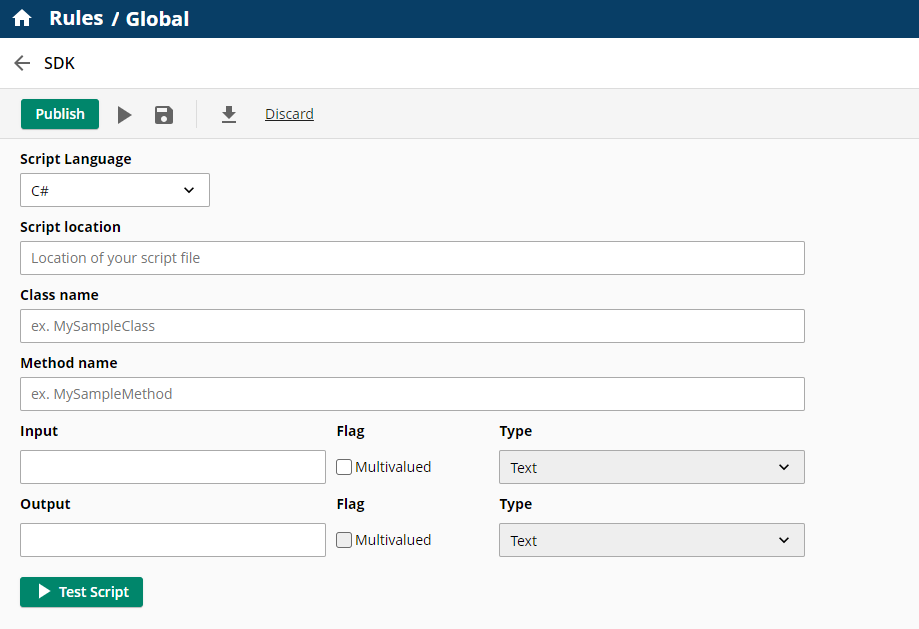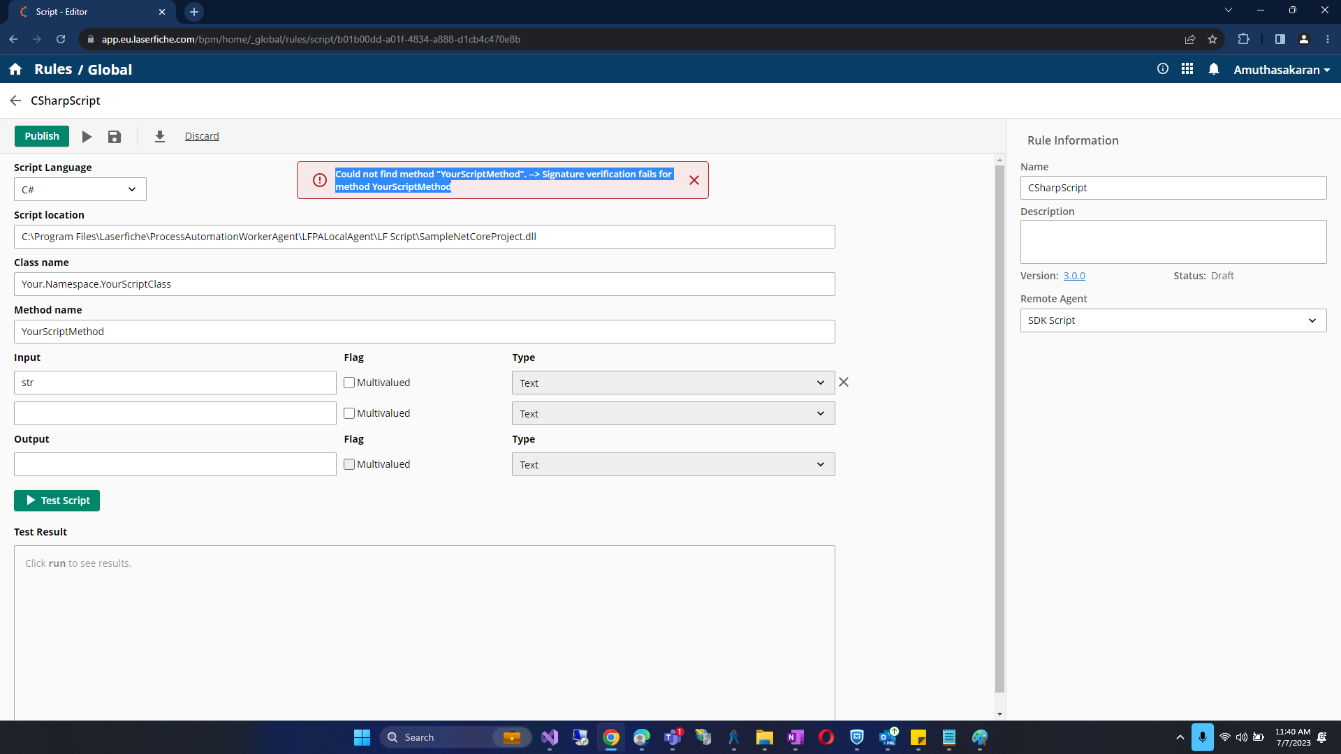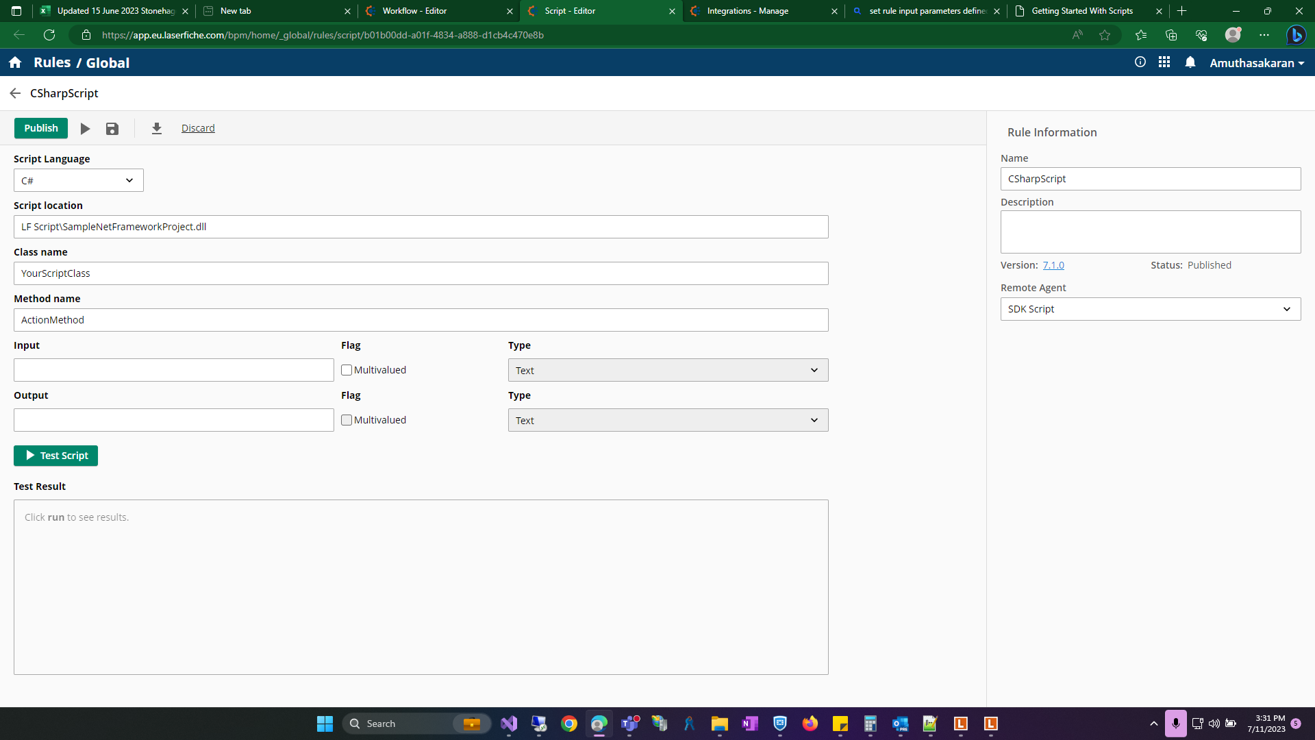 I have updated the readme for the sample C# script rules with step-by-step instruction on how to build-configure-test: https://github.com/Laserfiche/lf-sample-csharp-script-rules