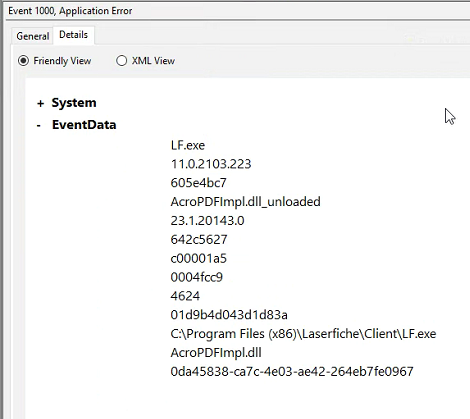 We are self hosted and I have one employee's computer that is crashing when she is generating pages.  Attached is the evnet data.  Any clues would be welcomed.